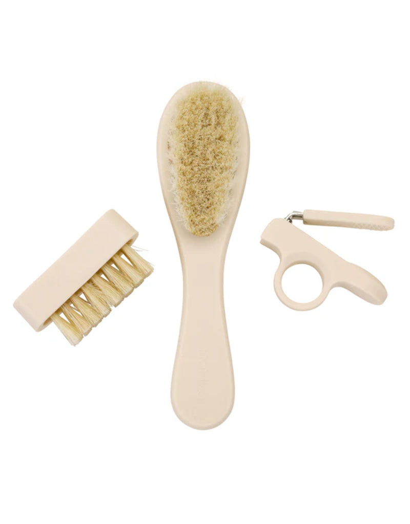 Brosse à ongles : Silicone, bois et poils naturels Brosse à cheveux : Silicone, bois et poils naturels.